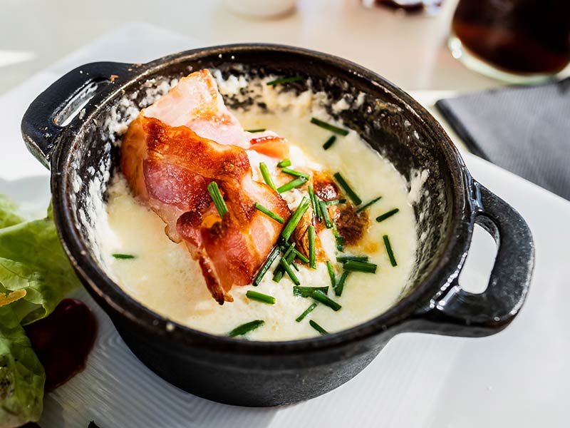 “Oeufs mayo” is a bistro staple that has seen a resurgence in popularity. It is hard-boiled eggs served cold, smothered in a high-quality, house-made mayonnaise, often garnished with fresh herbs or a sprinkle of paprika. Or it can be mixed and served in a mini cocotte as shown in the photo above (yum!).