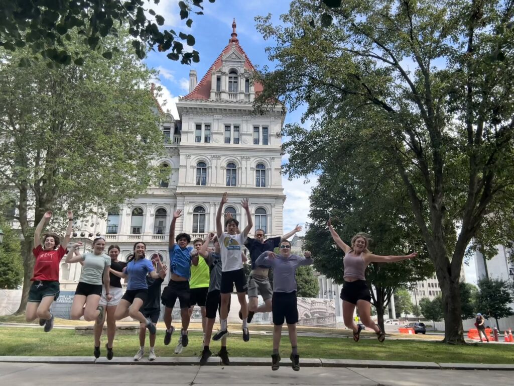 Greetings from Albany! We biked 23 miles today and arrived early in the day. On our way to Albany, a brief rain cooled us off. A flat tire briefly slowed us down, but we made the most of the delay by creating a miniature bowling alley with water bottles. After fixing the flat, we had lunch at a park in Albany and bought 50 donut holes for the group. Refreshed after a nice lunch, we toured the New York Capitol building which was bedecked with gold walls and glittering sconces on the inside. After the interesting tour, we happened to get free donuts from the Dunkin inside the Capitol. Boys accompanied our half mile ride to hotel with varying zoo animal noises and a cappella renditions of Carol of the Bells! We felt spontaneous and did some cartwheels outside the Albany observatory. We then biked half a mile to the Hampton Inn where a parent had generously organized for cookies to await us. Kids called home and everyone showered. As a treat, we enjoyed a Mexican food place that was so so fun and delicious!! We walked back to our hotel and talked about our day and how to make the most out of Albany tomorrow! 10/10